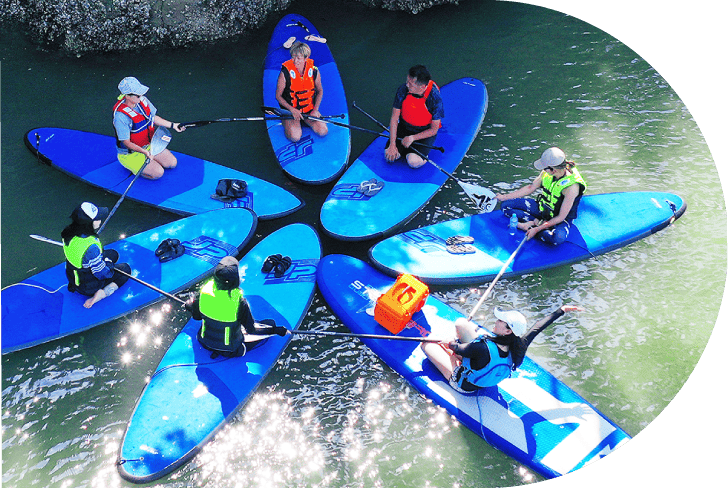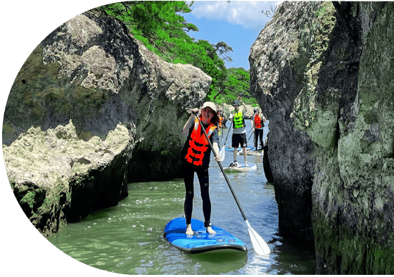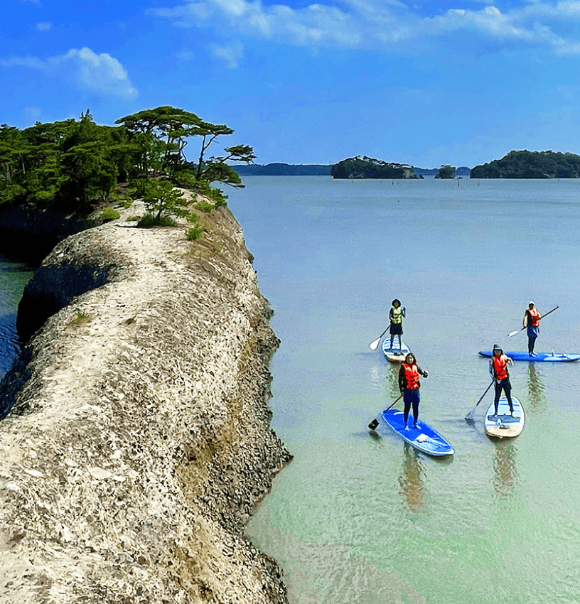 青く澄んだ海面、奇岩・島々を間近にお手軽SUP体験。松島湾の海上散歩は爽快感が抜群!レクチャーを受ければ誰でも簡単に乗りこなせるので初心者にもおすすめです。