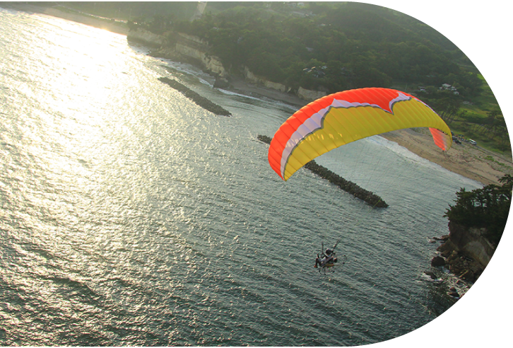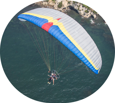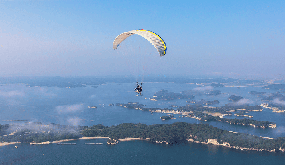 海の上から松島を観光できる特別体験!エンジン付きのモーターパラグライダーで天候に左右されにくく、10分以上のゆったりとした飛行が楽しめます。
